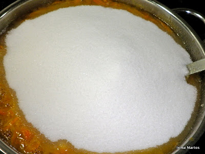 Una vez terminado el hervor, volvemos a pesar toda la masa y por cada kilo le echamos 1 kilo de azúcar.