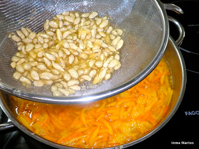 Al día siguiente hervimos de nuevo, a fuego medio-alto, moviendo a menudo para que no se pegue, entre 30 y 35 minutos, y sobre todo hasta cuando las cáscaras se vean casi transparentes